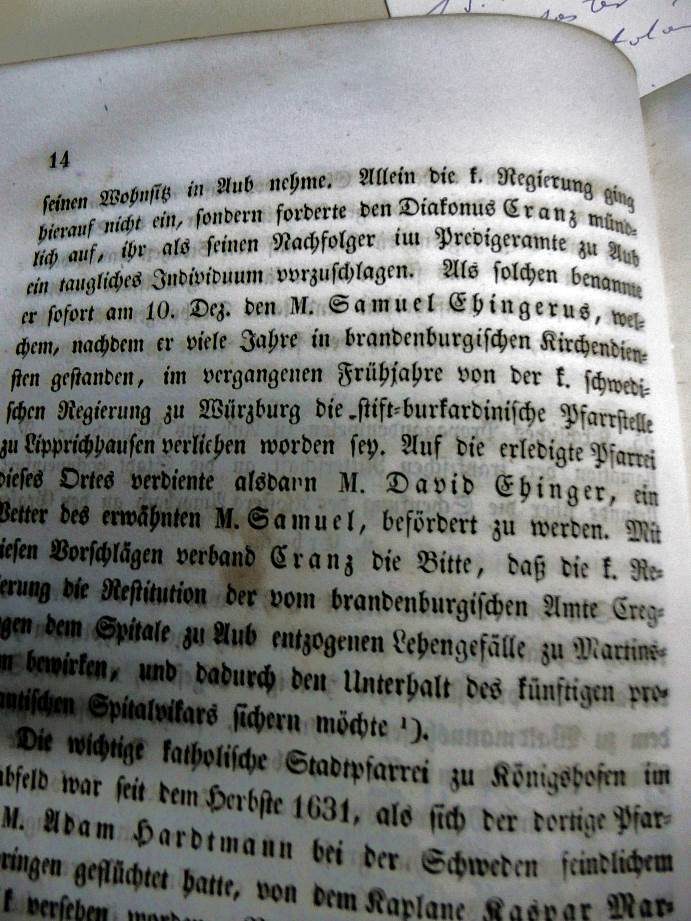 Nördlingen von Kaiserlichen Soldaten ausgeraubt. Die beiden Pfarerr wurden geschlagen und gestochen und mußten sich tagelang in benachbarten Häusern und Heu vergergen. Am 23. September 1634 starb Pfarrer Wolfgang Ammon der Jüngere an den Folgen der Mißhandlungen und an der Pest. Sein Nachfolger wurde sein Amtsbruder, der bisherige Diakonus Johann Kranz. Als dieser am 18. Sonntag nach Trinitatis in der Kirche nach der Predigt der Gemeinde vorgestellt werden sollte, wurden die Tore der Stadt erbrochen, stürmten Soldaten in die Kirche und schleppten den Geistlichen aus der bestürzten Menge, in der sich 136 Kommunikanten befanden, davon, setzten ihm das Gewehr an den Kopf und ließen ihn erst nach erhaltenem Lösegeld wieder frei. 'Die Nikolaikirche zu Marktbreit in Vergangenheit und Gegenwart' von Kirchenrat Hermann Wagner. Marktbreit 1961 |